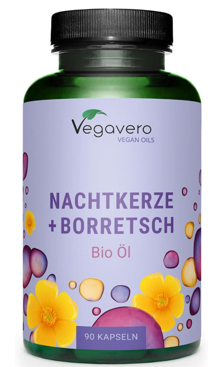 Evening Primrose Oil Vegavero®. El único Vegano & Orgánico, Aceite de Onagra y Borraja, Acné + Psoriasis + Eczema. Con Omega 6. Prensado en Frío. Sin Aditivos
